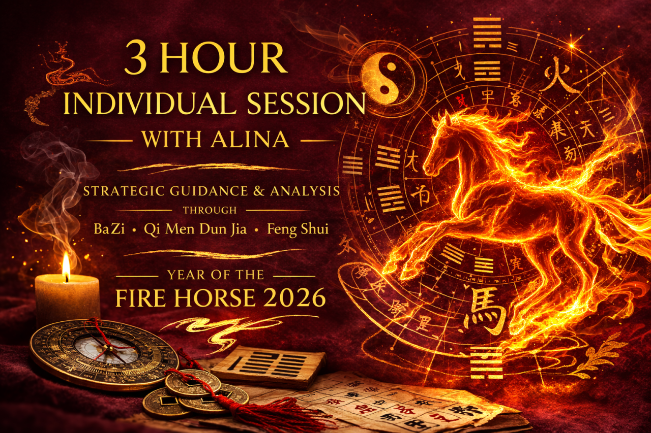 The 3-hour private session with Alina is designed for focused recalibration and strategic clarity within a defined life domain. This format allows for a structured analysis of your personal configuration through BaZi, Qi Men Dun Jia, and Feng Shui principles, correlated with the energetic dynamics of the Fire Horse 2026 cycle. The session concentrates on one to two priority areas—such as business direction, career decisions, relationship dynamics, or environmental alignment—while identifying timing windows, risks, and leverage points. You receive clear interpretations, practical adjustments, and a defined action framework that can be implemented immediately. The outcome is precision: understanding where to act, where to wait, and how to align your decisions with both your personal energetic structure and the momentum of the year.